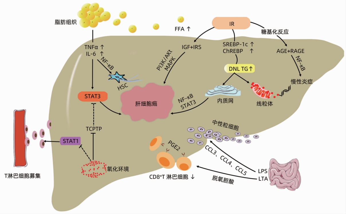 脂肪组织储存过量能量,会促进肥胖患者体内慢性炎症的产生。脂肪细胞和巨噬细胞分泌的炎症因子,如肿瘤坏死因子(TNFα),白介素(IL-1、IL-6)等在肥胖情况下上调。TNFα、IL-6激活非脂肪组织中JAK/STAT3促瘤信号,导致肝细胞增殖凋亡失控而促进HCC发生。
